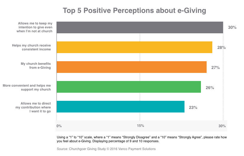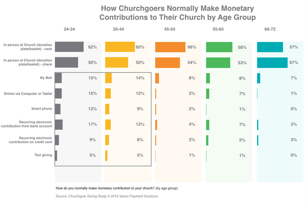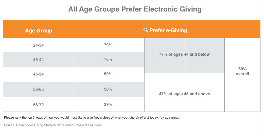There you have it. The most engaged church members, not just those on the fringe, prefer to have the option to give electronically. This debunks the myth that it’s just young people and those who give sporadically or randomly are the ones who use e-giving methods.